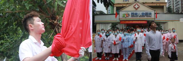 随后,伴随着激昂的国歌和优美的院歌,五星红旗和西南儿童医院院旗相继冉冉升起。西南儿童医院全体工作人员昂首挺胸,深情歌唱国歌和院歌,以比较庄严和圣神的仪式表达着对伟大祖国“生日”的祝福。