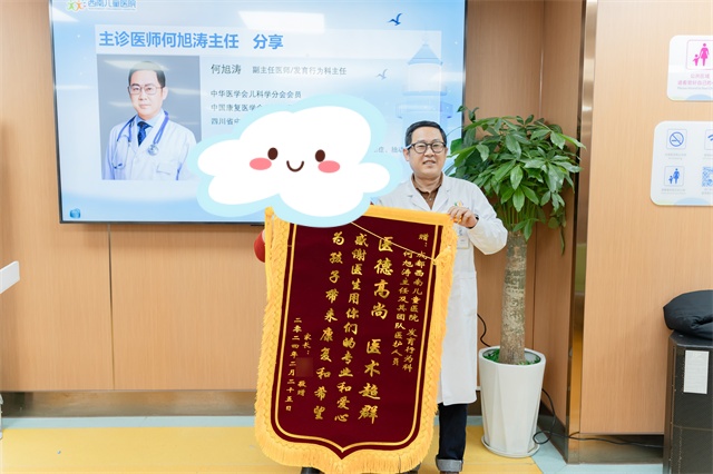 一开始,孩子的爸爸是不同意治疗的,认为是智商税,只有妈妈一个人坚持陪伴孩子治疗。妈妈坦言,孩子14岁了才真正开始干预,遇到了很多困难。好在孩子一直坚持配合,经过一段时间干预过后,孩子的记忆能力提升,背单词越来越快,后来的一次考试直接考到班上第三名,小宇自信心也提升了,孩子的爸爸也改变了原有的看法,家庭关系也和睦许多。“如今孩子的成绩越来越好,非常有希望考入重点高中!”妈妈欣慰地讲到。为了感谢主诊医生何旭涛主任的帮助,小宇的妈妈特意借活动的机会为医生赠送了一面锦旗。