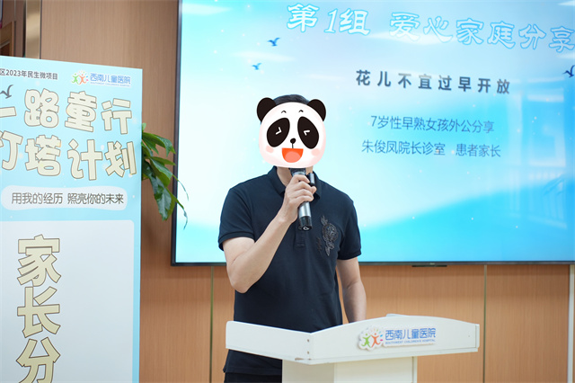 首先上台进行分享的是爱心家长——西西(化名)的外公。外公讲述了是如何发现西西的性早熟问题,并坚持带孩子来到西南儿童医院接受治疗的经历。原来,在一次常规体检中,发现西西骨龄偏大、胸部有发育,西西的父母觉得孩子只是稍微比同龄人发育得快些,应该问题不大,认为没必要干预。