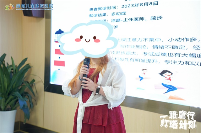 随后,成成的主诊医生徐磊院长也针对成成的情况作了分享。徐磊院长表示,成成在刚来就诊的时候注意力比较差,但情绪还算稳定,后来在治疗中孩子和家长都心态乐观,并且一直积极配合。尤其是成成的父母在教育方式上也做出了改变,学会了倾听孩子的心声,对孩子不打骂,用耐心和爱心来引导成成。正是他们全家人团结一心,共同面对挑战,才为成成的康复之路打下了坚实的基础。
