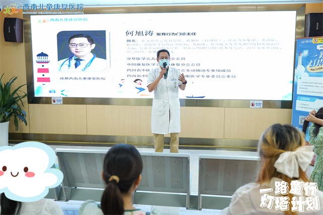 随后,孩子的主诊医生何旭涛主任也上台讲述了妮妮的治疗情况。他指出,康复治疗的关键在于早期干预和家庭的全力配合。他解释道:“我们在妮妮的治疗过程中,重点关注了心理疏导,帮助她缓解学习压力,逐步引导她学会用积极的心态面对生活中的各种问题。”何主任特别提到,治疗的成功不仅在于技术的运用,更在于对孩子情感的关注和呵护,“我们希望通过治疗,不仅让孩子摆脱症状,更能帮助他们找到自信,融入社会。”
