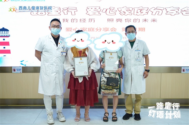 活动最后,孩子的主诊医师们为两组爱心家庭颁发了爱心证书,感谢他们愿意用亲身经历给予其他家长康复的希望,为更多的家庭指引了前进的方向,点亮了希望之光。